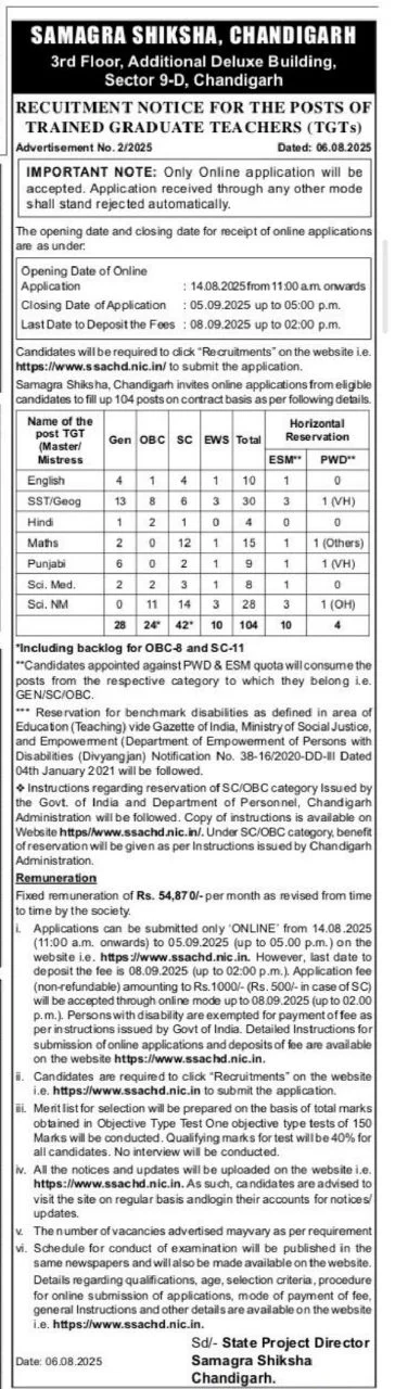 Samagra Shiksha, Chandigarh has released an official notification for the recruitment of Trained Graduate Teachers (TGTs) on a contract basis. A total of 104 vacancies are announced across various subjects including English, Hindi, Maths, Punjabi, Social Science, and Science. Interested and eligible candidates can apply online from 14 August 2025 to 5 September 2025 through the official website of SSA Chandigarh: www.ssachd.nic.in.