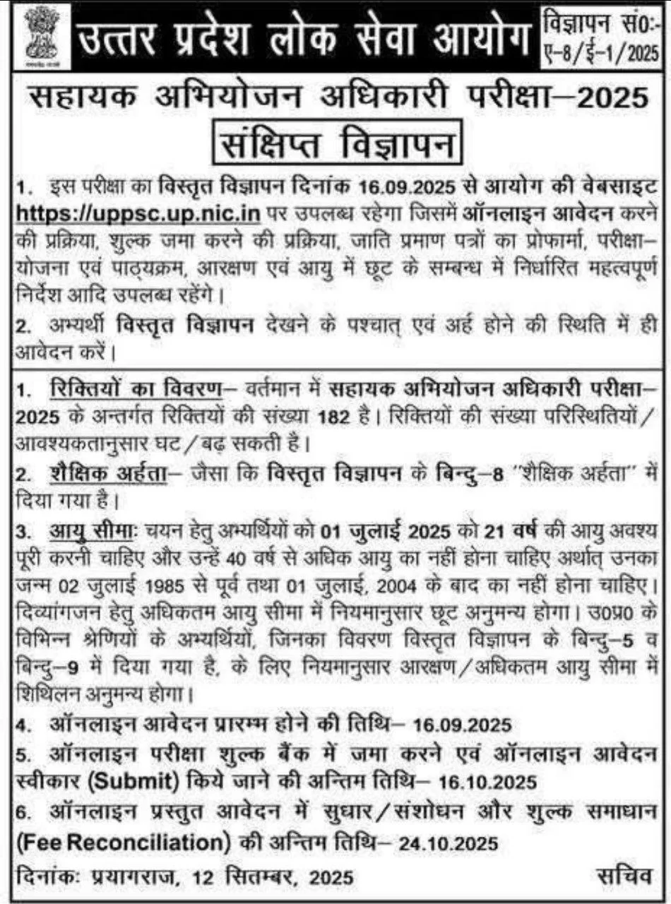 Uttar Pradesh Public Service Commission (UPPSC) has announced the notification for Assistant Prosecution Officer (APO) Examination 2025 under Advertisement No. A-8/E-1/2025. A total of 182 vacancies have been released for the post of APO. Eligible and interested candidates can apply online through the official website of UPPSC – uppsc.up.nic.in starting from 16th September 2025.